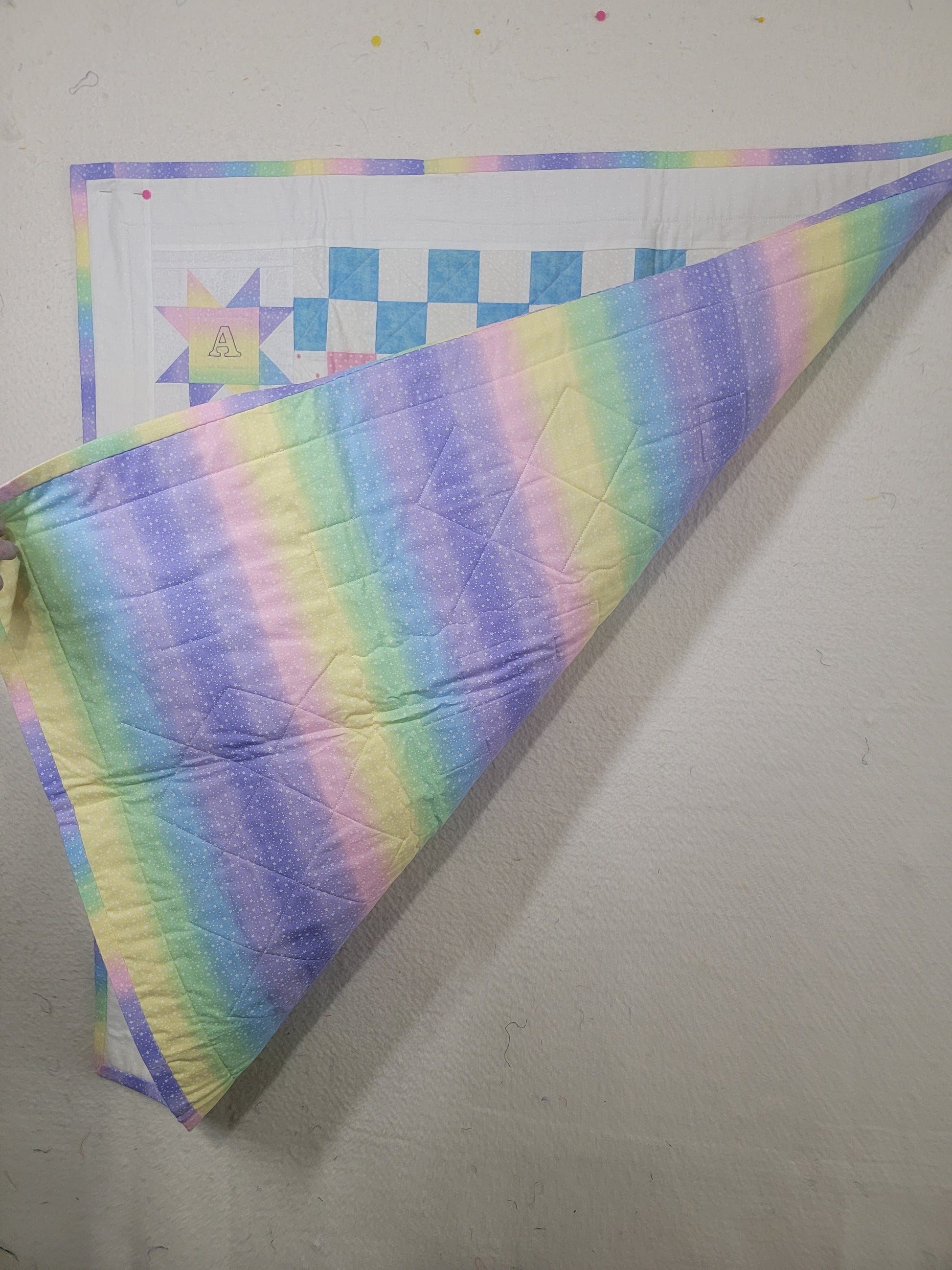 Crafted from comfortable cotton, this 34" x 39" baby quilt is as stylish as it is cozy. It features an endearing checkered design with friendly bears on one side, and a pastel striped pattern on the other.
