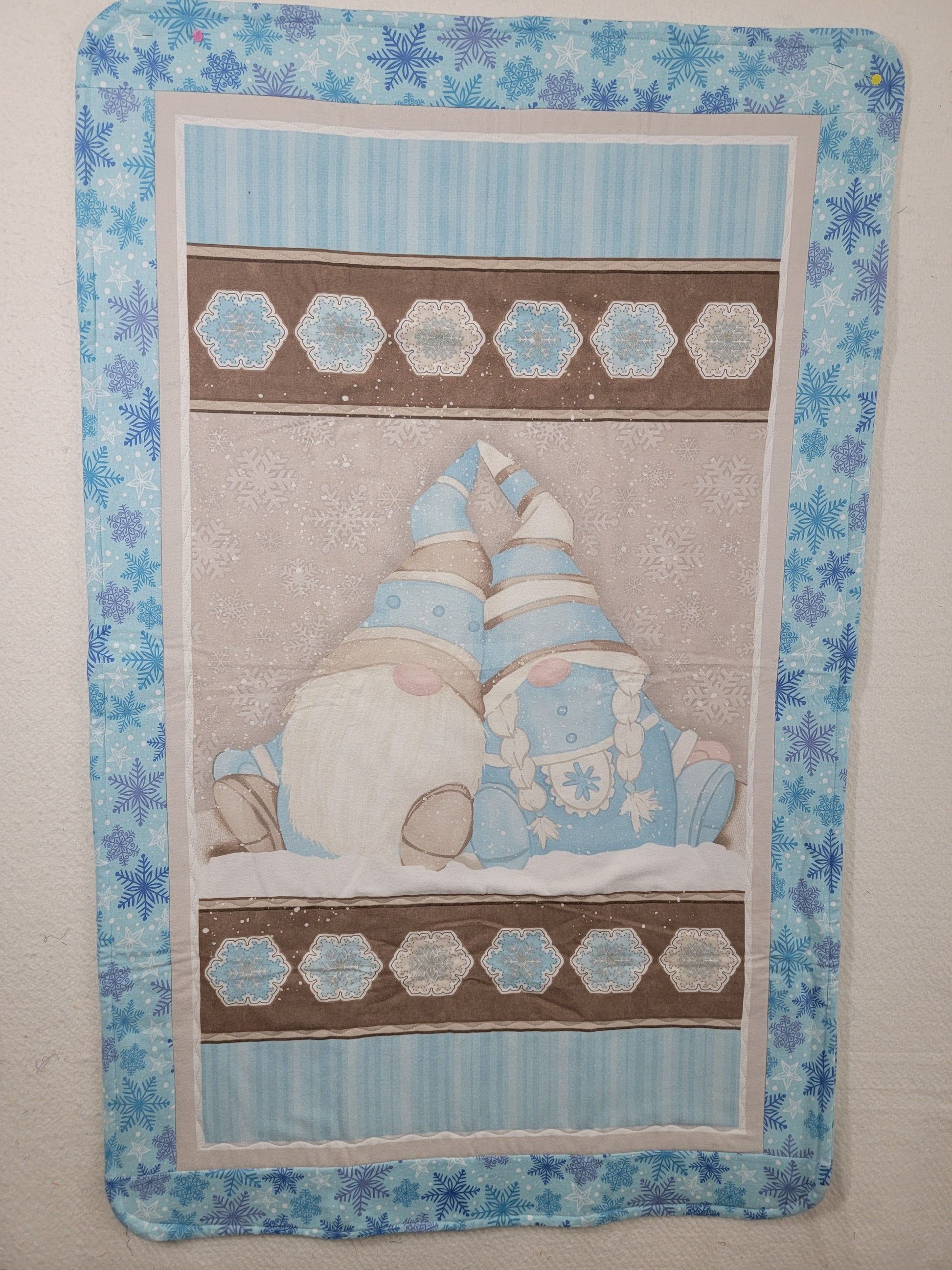 Bring a touch of whimsical winter charm to your little ones nursery this gnome baby quilt (29.5in x 46in) this flannel delightful cozy. Featuring an adorable pair of snuggling gnomes in soft blues and whites, set against a snowy backdrop with subtle stripes and snowflake medallion accents. The entire piece is beautifully framed with a coordinating blue snowflake border. The reverse side showcases the same lovely blue snowflake fabric, making it attractive from any angle. Perfect for adding a cozy, festive touch to any little ones environment.