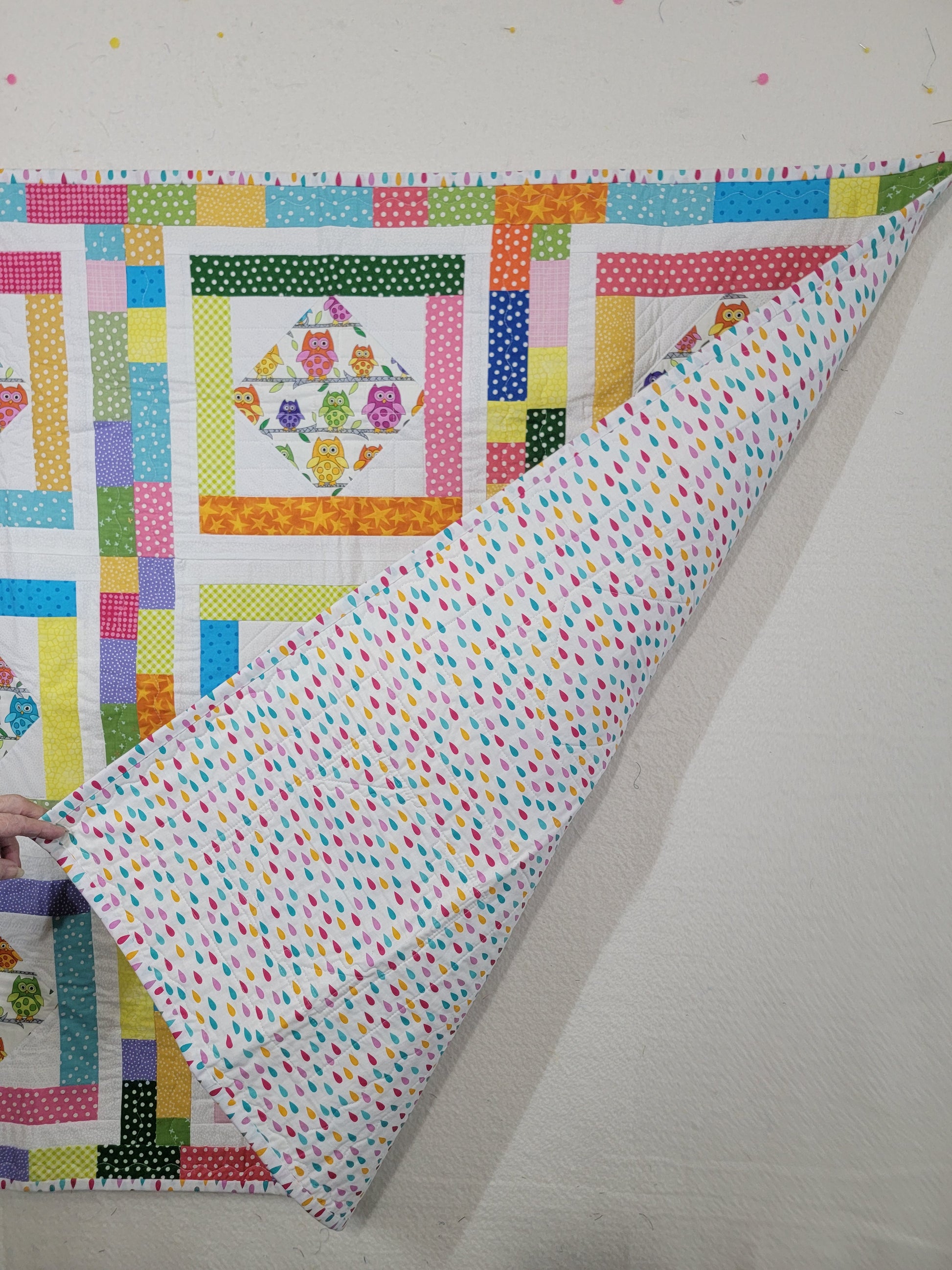 Brighten any nursery with this beautifully handcrafted baby quilt (45 in x 39.5 in)! The design features nine delightful blocks, each showcasing a sweet print of colorful cartoon owls. These owl scenes are expertly framed with a variety of coordinating fabrics – cheerful polka dots, sunny solids, and other playful patterns in a spectrum of vibrant hues. A dynamic scrappy border adds extra charm and color. The quilt is backed with a fun white cotton fabric featuring a whimsical pattern of multi-colored raindrops, and is neatly finished with a matching binding. This quilt is ready to bring smiles and cozy comfort to your little one!