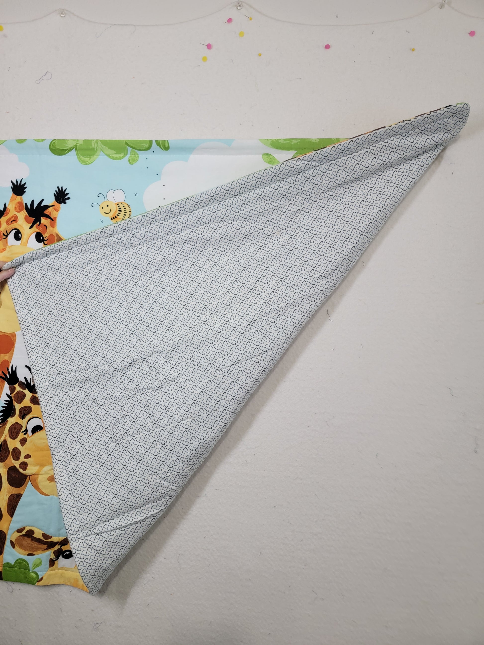 Wrap your little one in this delightful 40 by 33-inch baby blanket. The breathable cotton front showcases a whimsical pattern of friendly giraffes, buzzing bees, and leafy treetops, while the reverse offers a cozy flannel backing in a soothing light and dark blue design.