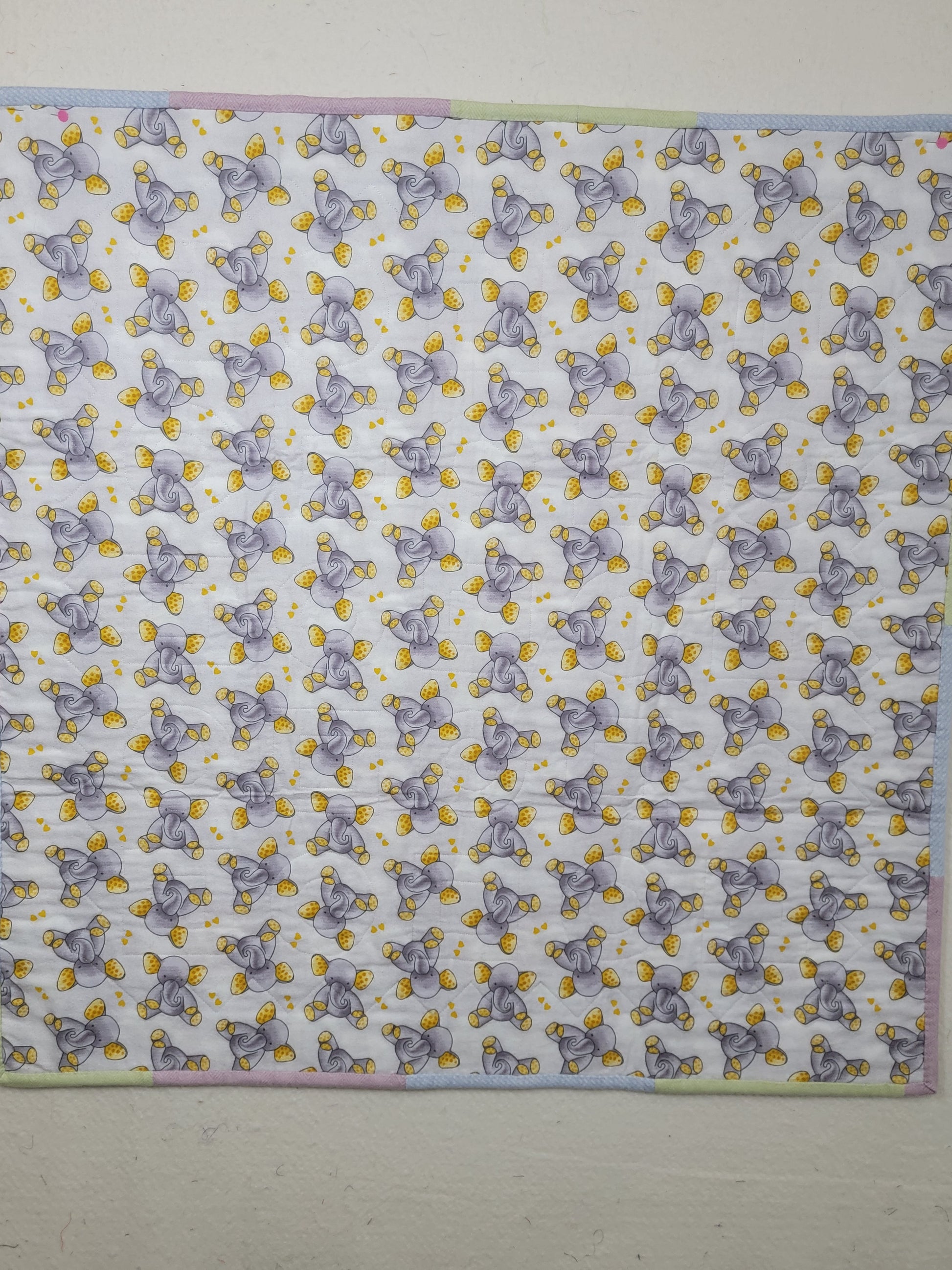 This adorable flannel baby blanket, sized at 36x35 inches, features a playful pattern of baby elephants in lovely shades of yellow, green, blue and purple. Perfect for snuggles and adding a sweet touch to the nursery.